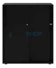 Dit is de Bisley schuifdeurkast Glide II van het formaat 116,1 cm hoogte bij 100 cm breedte en 47 cm diepte. De hoogte van de kast is variabel door de stelpootjes onder de kast: 114,9 tot 117,3 cm. De kleur van deze kast is Zwart RAL9005. De poedercoating van deze kleur is een structuurlak.